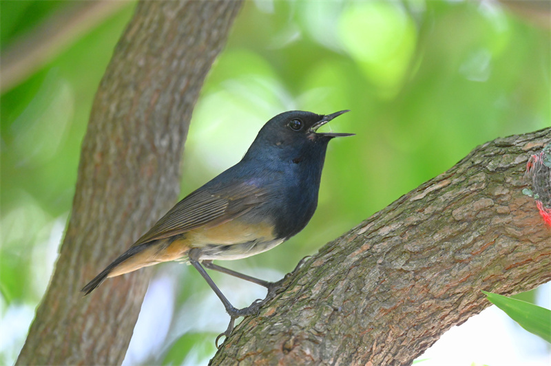 猛禽展翅、鸛掠淺灘、眾鳥覓食……夏日,位于河南省洛陽市欒川縣的伏牛山國家級自然保護(hù)區(qū)龍峪灣迎來了一年一度群禽集結(jié)盛況。2024年6月18日,一對夫婦在龍峪灣拍照時(shí),突然,一道黑影闖入鏡頭,他們來不及多想就連忙摁下快門。原來,這是一只黑喉歌鴝,它的腹部呈黃白色,頭頂、背、兩翼及腰皆為青石藍(lán)色,看起來靈巧可愛。