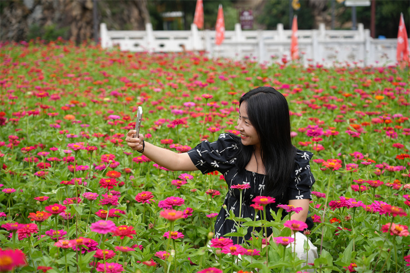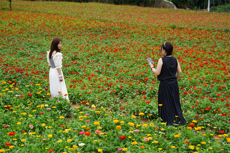 7月13日,走進河南省洛陽市欒川縣欒川鄉(xiāng)養(yǎng)子溝村,看到百日菊正競相綻放,紅、粉、黃、白、橘……各色花朵層層疊疊、錯落有致,蝴蝶、蜜蜂縈繞其間,宛如一幅迷人的五彩畫卷。
