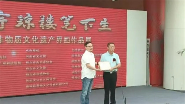 開(kāi)幕式上,王健將自己象征著祥瑞如意的界畫(huà)作品《祥龍圖》捐贈(zèng)給了河南省文化館,省文化館展覽部主任龐東晨代表文化館為王健頒發(fā)了捐贈(zèng)證書(shū)。