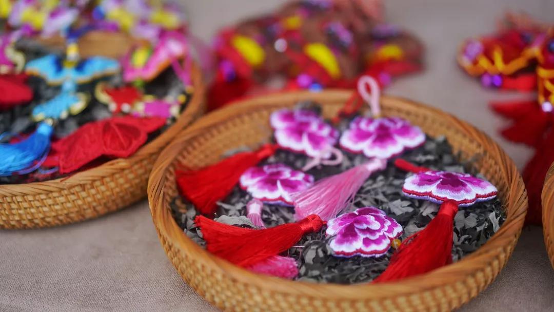 而此時,趙海亮的故鄉(xiāng)竹林鎮(zhèn)也飛速發(fā)展著,在故鄉(xiāng)的邀請下,他把公司的經(jīng)營放到了竹林鎮(zhèn)。于是,在竹林鎮(zhèn)風(fēng)情古鎮(zhèn)主巷的一側(cè)出現(xiàn)了這么一間上下兩層、古色古香的香包店,迎接著四方來客。