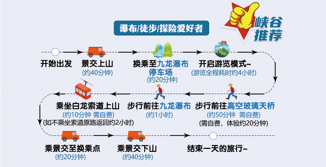線路推薦一:乘景區(qū)觀光車到九龍廣場,步行到達九龍?zhí)鞓、白龍吊橋(觀看白龍瀑布、織女瀑布)、九龍瀑布等高山瀑布群,乘坐白龍索道返回九龍廣場