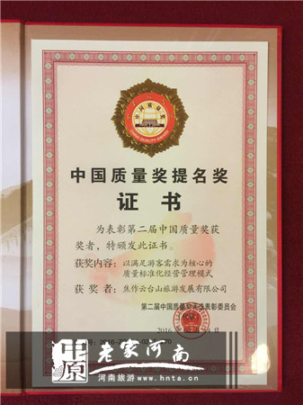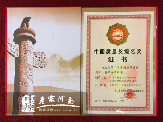 作為我國著名的山水景區(qū),云臺山景區(qū)經(jīng)過短短10多年的奇跡式發(fā)展后名聲在外。此次云臺山景區(qū)榮獲2015年的中國質(zhì)量獎提名獎,是由國家多個權威部門通過90個量化指標綜合考核得出的,也可以說,這個大獎是由530萬游客用腳投出來的。中國質(zhì)量獎提名獎的獲得,是云臺山品牌與服務的最好注腳,也意味著云臺山景區(qū)成為河南省唯一一家獲得中國馳名商標、全國質(zhì)量工作先進單位及首屆省長質(zhì)量獎三項殊榮的優(yōu)質(zhì)旅游服務企業(yè)。
