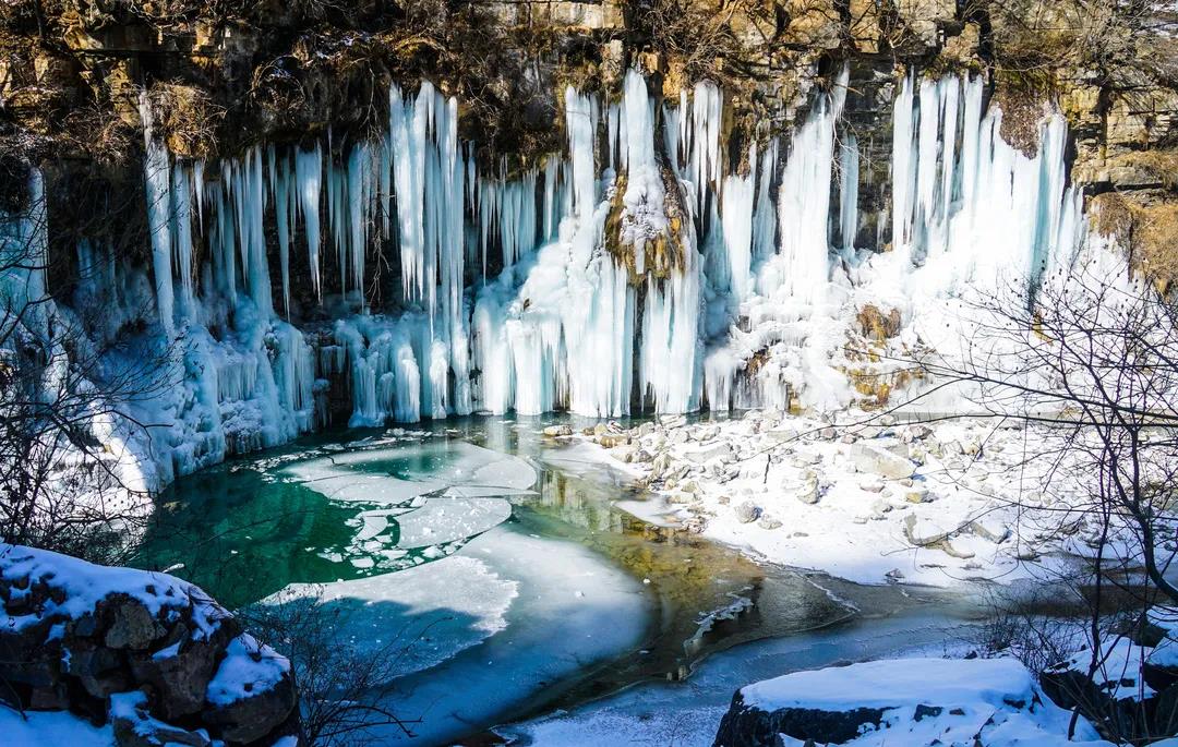 漫步深山,只見形狀各異的冰瀑、冰柱,層層復(fù)垂,玲瓏剔透。上面滴著的水珠,在陽光下變幻出令人眼花繚亂的光澤,往日絢麗的色彩歸于平淡,卻又不平凡,令人嘆為觀止。