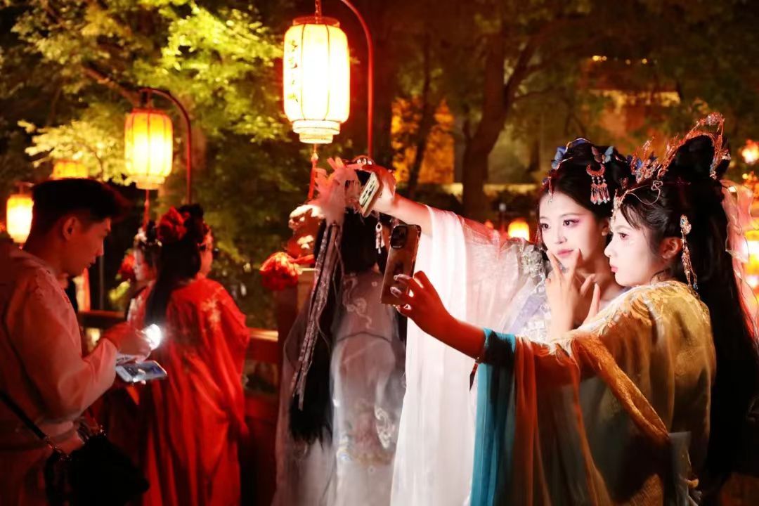 夜幕降臨,華燈初上。2024年7月4日晚,萬余名身著古裝的各地游客漫步在河南省洛陽市老城區(qū)洛邑古城,裙裾飄飄、團(tuán)扇遮面,仿佛穿越時空,夢回隋唐。