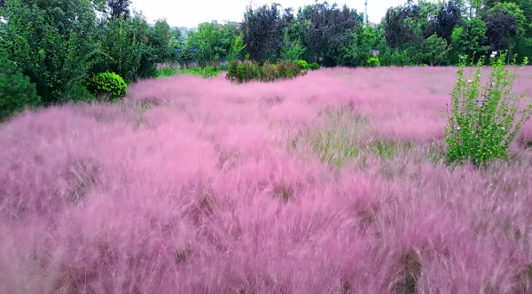 成叢生長(zhǎng), 遠(yuǎn)看如云似霧、如錦似霞, 近觀如同仙境一般。 微風(fēng)拂過(guò),掀起陣陣粉色“波浪”, 宛如彩霞氤氳的鋪染。