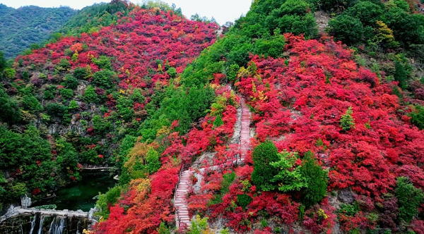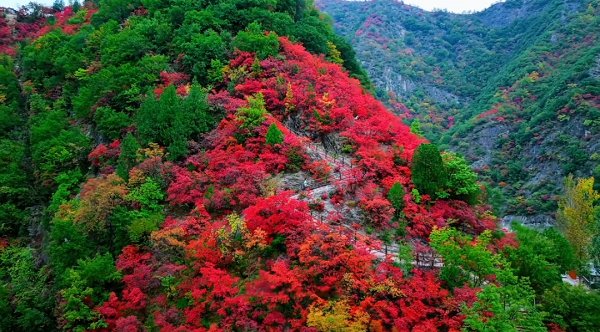 而每至深秋時(shí)節(jié), 更是紅葉滿谷,嬌艷如錦, 沿著山脊,順著山坡, 在藍(lán)天白云下,在山谷溪流旁, 形成一幅五彩斑斕的畫(huà)卷。