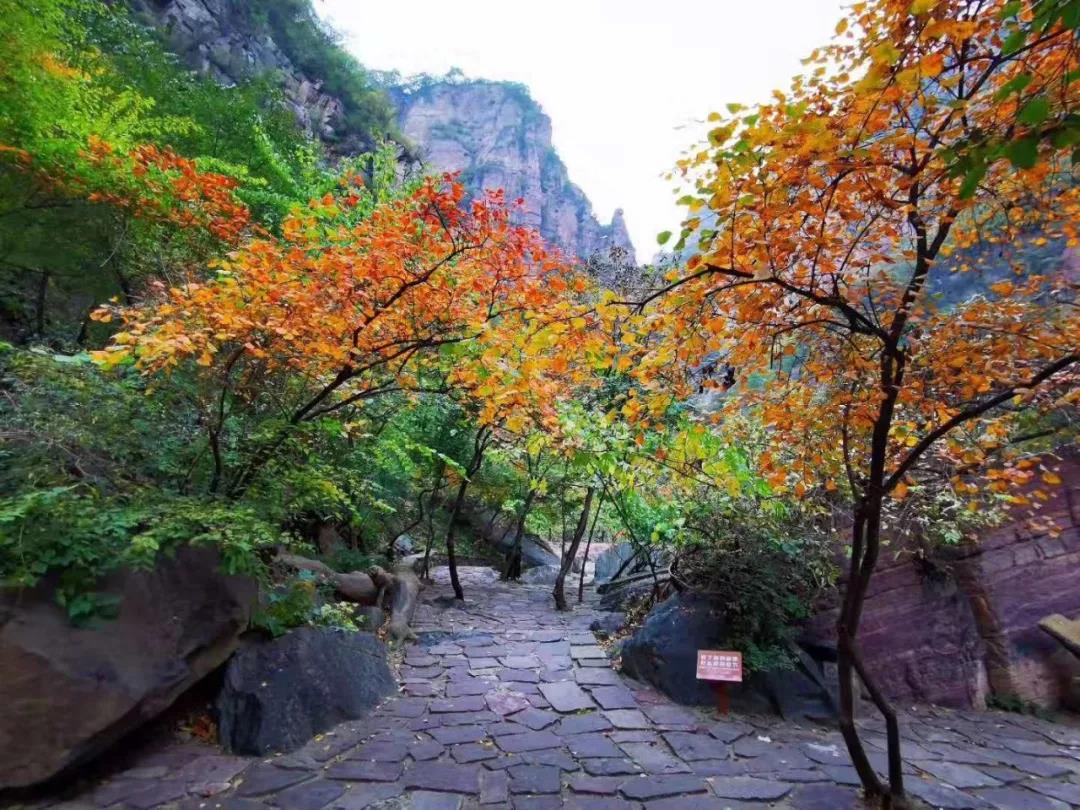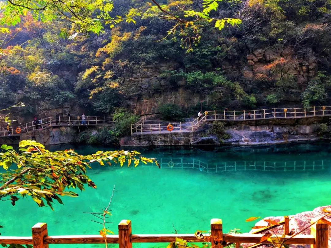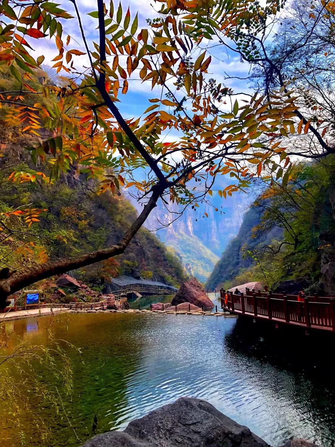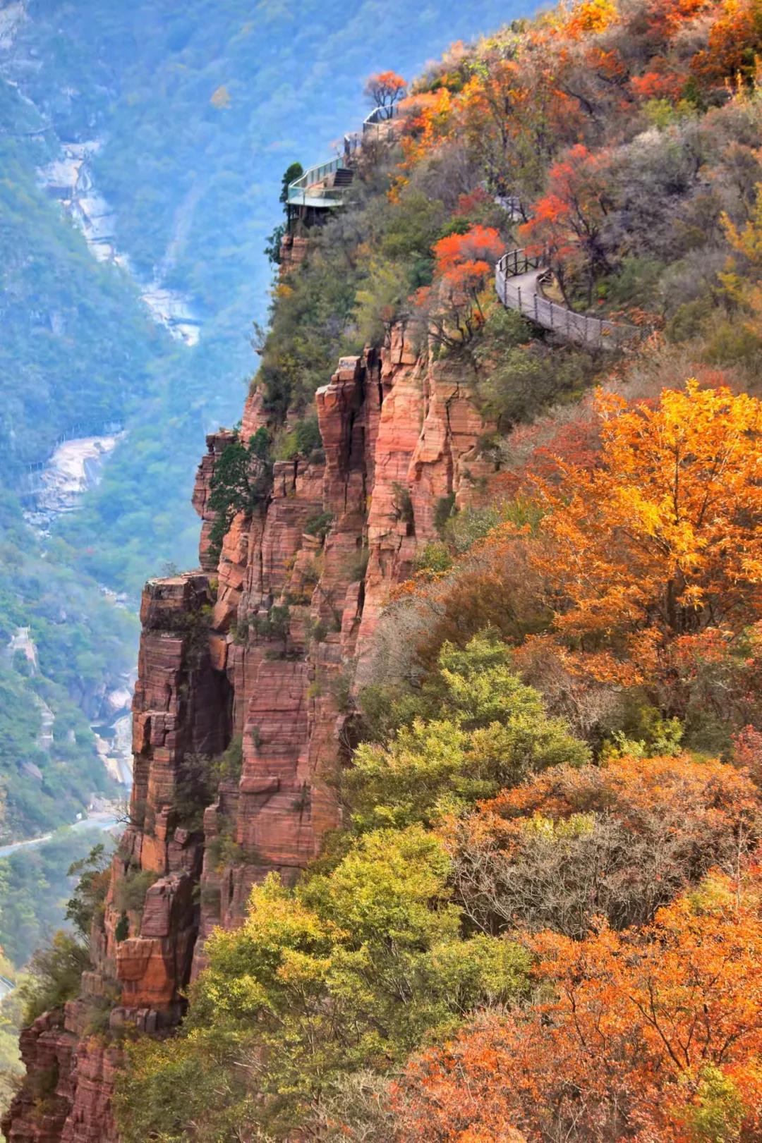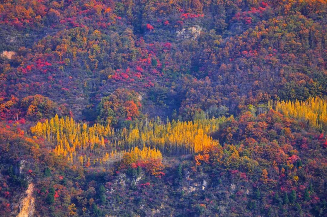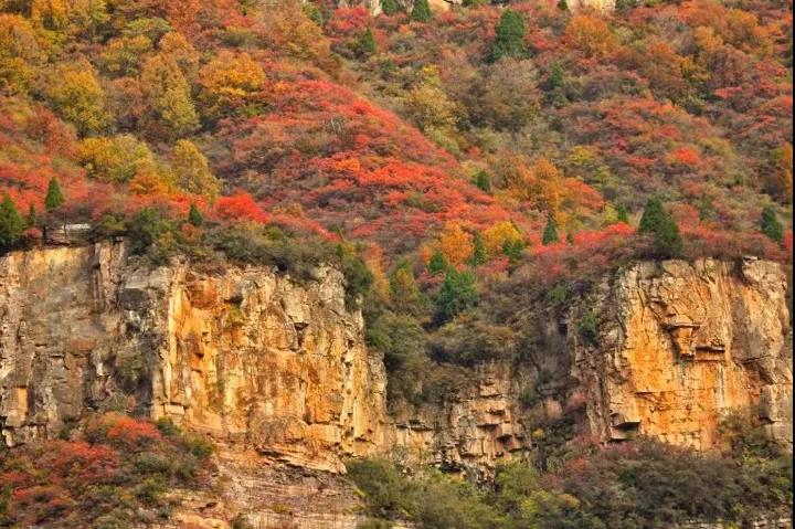 秋深露重,林野蒼茫。位于河南新鄉(xiāng)的寶泉大峽谷,已是層林盡染,萬山紅遍。碧水丹山之間的簇簇紅葉,依山就勢(shì)漫卷開來,其中更有黃櫨、翠柏等多種秋植、爭(zhēng)彩斗艷,炫目繽紛,與春日的百花齊放相比,更是別具一番風(fēng)韻。而這濃厚多彩的顏色,也讓本應(yīng)蕭瑟的秋風(fēng),變得熱烈。風(fēng)起云涌,峰巒如聚,波濤如怒,連綿起伏的太行山此刻猶如一片翻涌中的絢麗汪洋。汪洋之下,寶泉大峽谷內(nèi)飛瀑跌宕,如綢似練,與碧潭溪流共同映襯著五彩山林,繪就了一幅秋色無邊的太行秋圖。