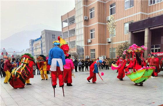 活動中,省級非遺項目旱船、地燈戲、三壁吹打樂、踩高蹺、舞獅和新縣民歌的傳承人們陸續(xù)上陣、現(xiàn)場表演,整個學校鑼鼓喧天,樂聲齊鳴,好不熱鬧,孩子們個個歡天喜地,笑逐顏開,鼓掌叫好聲此起彼伏。