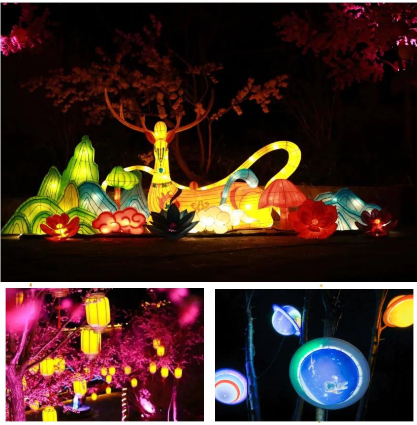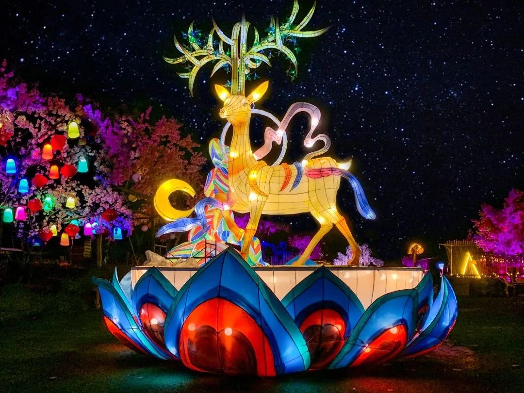 福鹿同行、守福待兔、星球宇宙等花燈,過年氛圍直接拉MAX!穿漢服漫步在燈籠橋上盡情打卡。
