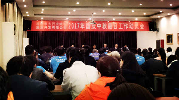 目前,景區(qū)旅游接待工作已準備就緒:2017年9月27日召開“林州市太行大峽谷旅游開發(fā)有限公司2017年國慶中秋假日工作動員會”,制定“太行大峽谷2017年旅游接待工作方案”,對景區(qū)工作人員實行定位、定崗、定責;在停車場入口處安裝了先進的空余停車位電子提示顯示屏,能夠快速引導游客找到空閑的停車位;購置了一批綠植花卉,美化景區(qū)環(huán)境,營造節(jié)日氛圍;全面檢查景區(qū)內各項游覽設施,確保游客旅游安全;組建成立了景區(qū)治安小組,維護旅游秩序;和往年黃金周一樣,數百名安陽市高校青年志愿者也將來到太行大峽谷景區(qū),協助工作人員維護景區(qū)秩序,成為景區(qū)另一道靚麗的風景。