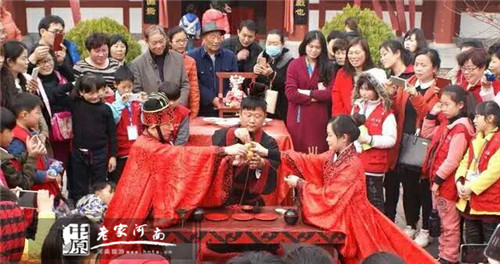 下午3點(diǎn),游客們?cè)趯?dǎo)游的帶領(lǐng)下來(lái)到芒碭山漢禮儀文化傳媒公司,觀看被譽(yù)為中國(guó)舞蹈“活化石”的儺舞演出,部分游客參與了漢婚禮體驗(yàn),體會(huì)結(jié)發(fā)夫妻的含義。