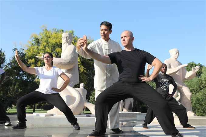 外籍學員在太極十三式雕塑廣場習練太極拳 徐宏星 攝