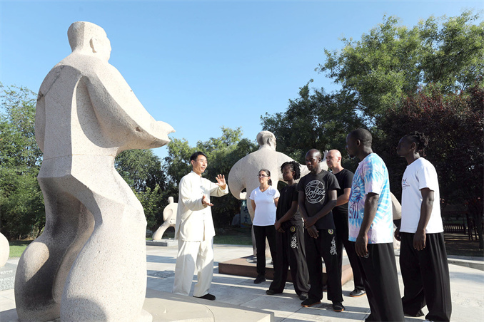在溫縣陳家溝太極十三式雕塑廣場,陳炳為外籍學員講解太極文化。 徐宏星 攝