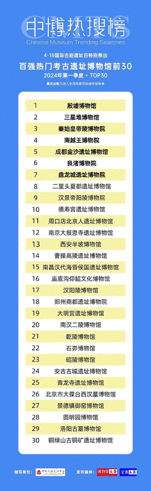 4月22日,記者獲悉,中博熱搜榜特別發(fā)布2024年第一季度“考古遺址博物館前30榜單”。其中,安陽殷墟博物館位列榜首、曹操高陵遺址博物館位列第14。