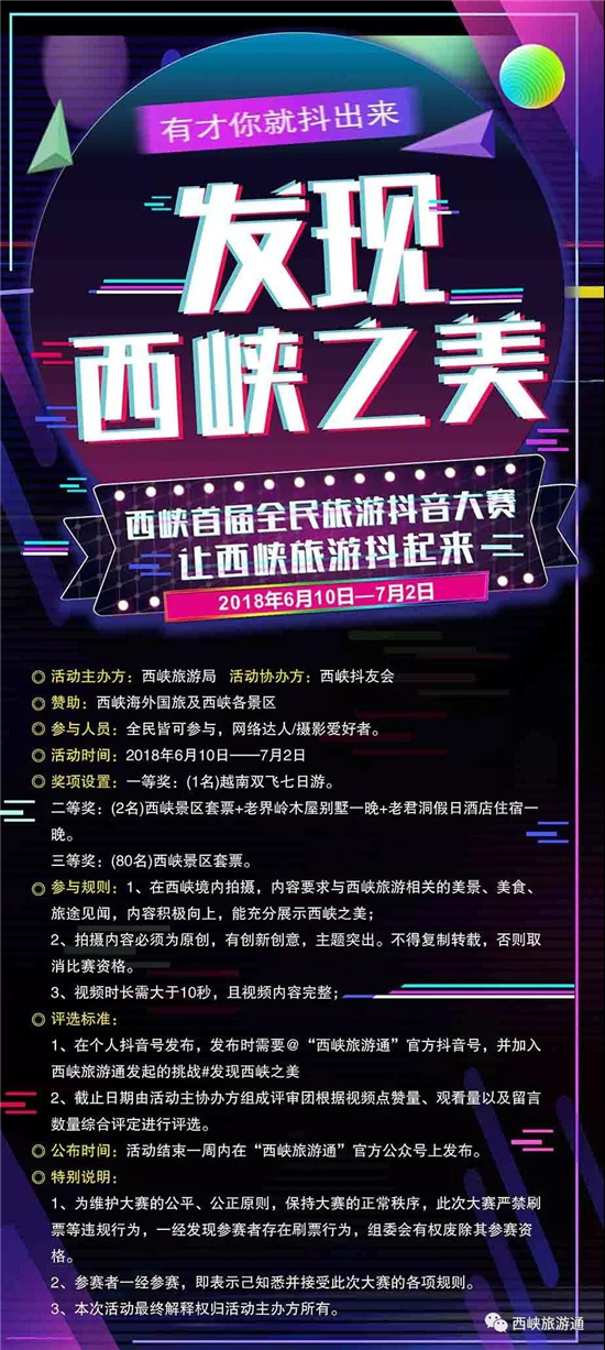 最后,“全民旅游”愛好者們,想參與“發(fā)現(xiàn)西峽之美”抖拍大賽,參與方式告訴你,你可以盡情打卡、刷屏啦!