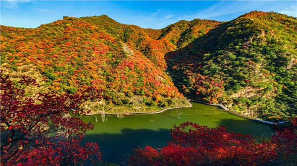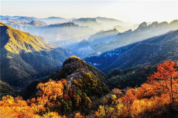 遠(yuǎn)眺王屋太行,漫山遍野峰嶺溝壑,都被或橙紅、或艷紅、或淺紅的紅葉包圍,動(dòng)人心弦。