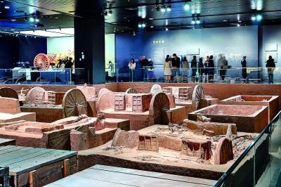 在二樓展廳展出的名為“陶”的文物,形狀呈圓餅狀,表面微微凸起,密密麻麻,這是商朝人洗澡時(shí)的清潔用具。殷墟考古發(fā)掘工作中,發(fā)現(xiàn)一種車,車前俯身埋著兩個(gè)人,這很可能是一種人力車,文獻(xiàn)稱為“輦車”。在“車轔轔,馬蕭蕭”展廳,社科院考古所現(xiàn)場(chǎng)考古,把發(fā)掘過程展示給游客。
