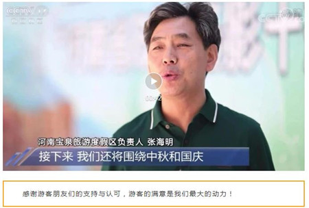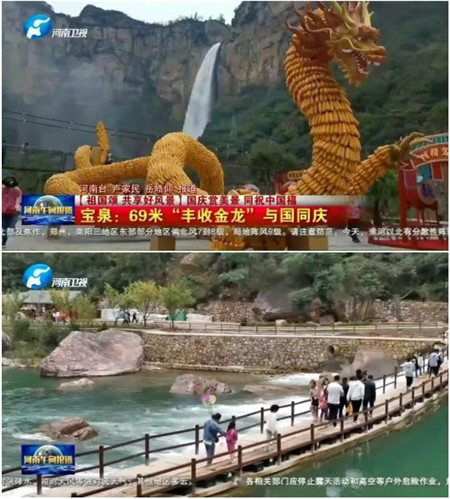 10月5日中午12點(diǎn)10分河南電視臺《午間報(bào)道》以“祖國頌,共享好風(fēng)景”為題對寶泉景區(qū)進(jìn)行重點(diǎn)報(bào)道。寶泉69米“豐收金龍”與國同慶,讓游客歡度國慶時(shí)感受祖國大地豐收的喜悅,一邊欣賞山水風(fēng)光,一邊觀看非遺文化,一邊享受豐收盛景,讓游客們在此流連忘返!