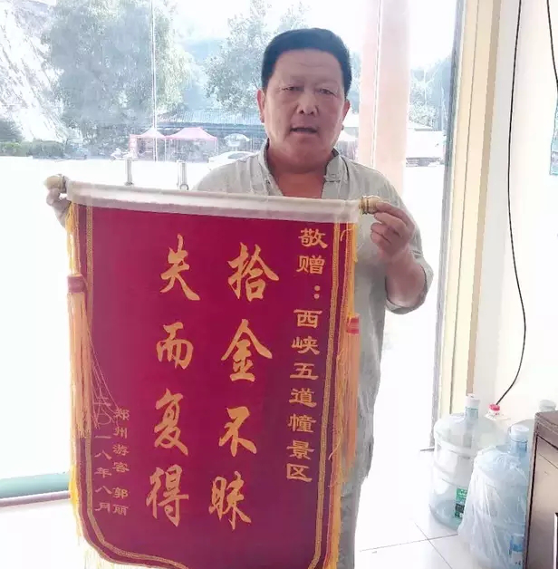 “真的非常感謝你們!五道幢景區(qū)不僅風景好,工作人員更好!”當接過張?zhí)於魇种械氖痔岚鼤r,郭女士女士連聲感謝。鄭州游客郭女士還專程送來了錦旗,以此來感謝景區(qū)工作人員的拾金不昧。