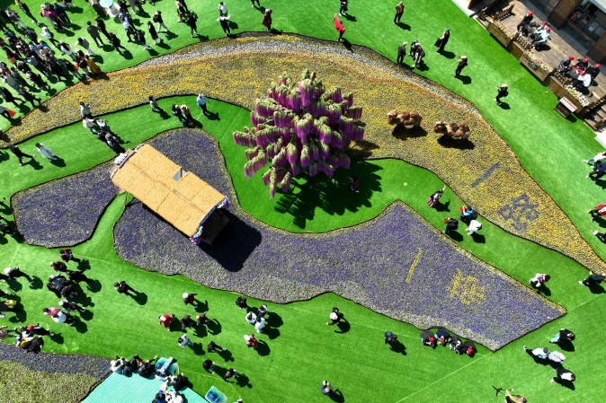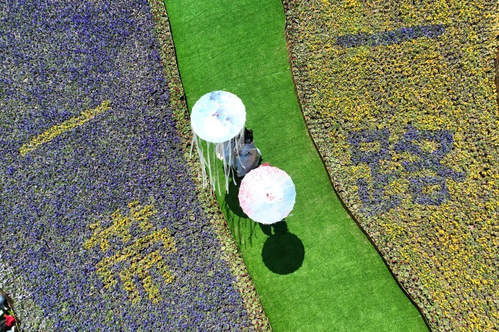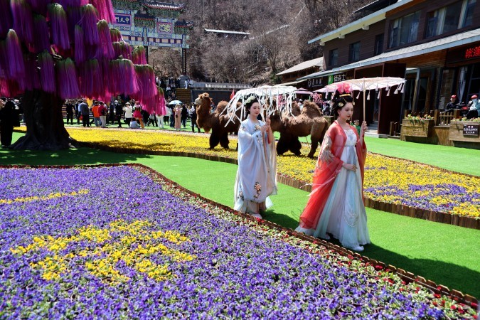 2023年4月1日,為慶祝“一帶一路”10周年,河南省洛陽市欒川縣老君山景區(qū)花海節(jié)開幕,景區(qū)用10萬盆鮮花鋪就“一帶一路”,用金黃色和深藍色花海分別代表著陸上和水上線路,并鑲嵌相關(guān)標識,展現(xiàn)美好愿景,寓意“一帶一路”前程似錦,一路生花。