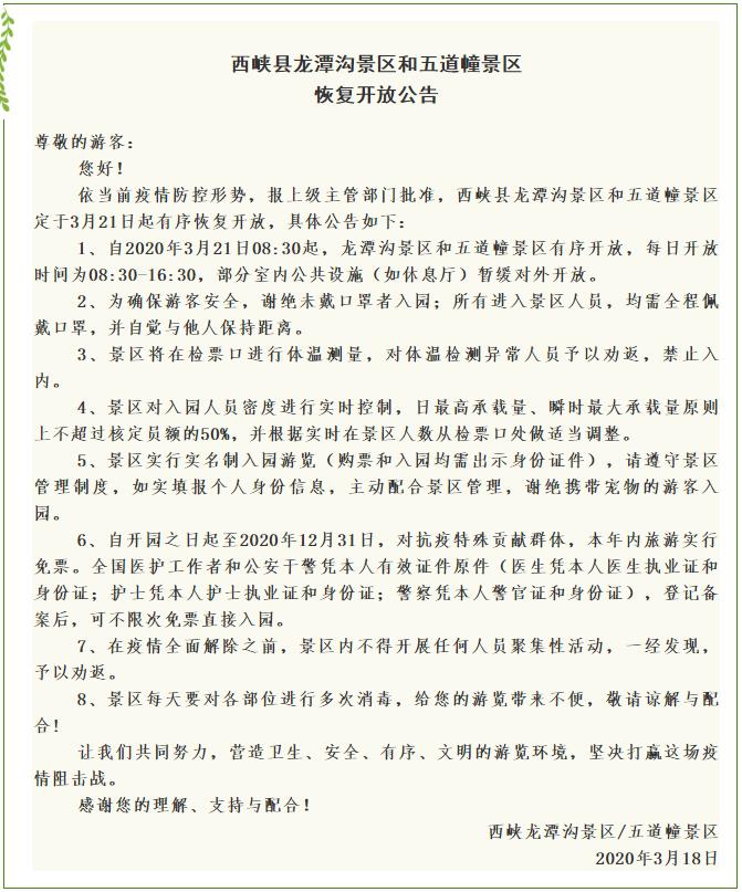 好消息來(lái)了,依據(jù)當(dāng)前疫情防控形勢(shì),報(bào)上級(jí)主管部門(mén)批準(zhǔn),西峽縣龍?zhí)稖暇皡^(qū)和五道幢景區(qū)定于3月21日起有序恢復(fù)開(kāi)放。