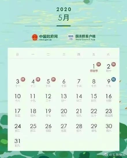 放假安排:5月1日至5日放假調休,共5天;4月26日(星期日)、5月9日(星期六)上班