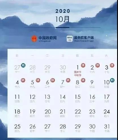 放假安排:10月1日至8日放假調休,共8天;9月27日(星期日)、10月10日(星期六)上班。