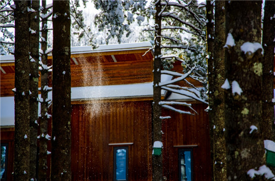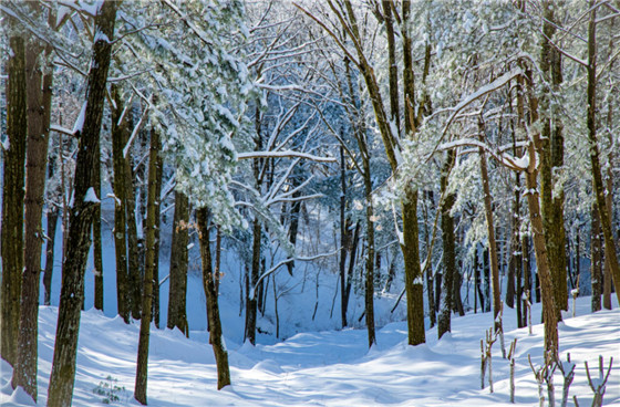雪后放晴的森林里,陽光一棱一棱,明暗交錯(cuò),雪花林間灑落,浪漫唯美。
