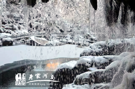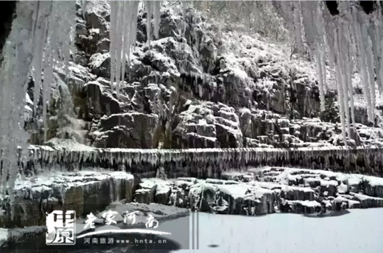 夏看天瀑奇觀,冬賞銀河倒掛。沿著景區(qū)小道走到峽谷盡頭,就是欣賞天然冰雕的地方。
