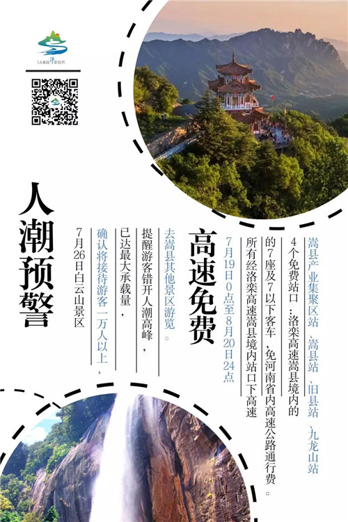 7月26日早上,開始在洛陽網(wǎng)、愛洛陽網(wǎng)、5A嵩縣官方微信公眾號、嵩媒矩陣等媒體發(fā)布預警及海報,在四個高速站點、各咨詢臺提前發(fā)布客流預警,引導游客錯峰出行,分流至縣內其他景區(qū)。