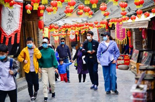 上午九點(diǎn),記者在鞏義市康百萬(wàn)莊園景區(qū)看到,游客們戴著口罩,正有序地排隊(duì)登記、購(gòu)票、掃碼、測(cè)溫,準(zhǔn)備進(jìn)入景區(qū)參觀。園內(nèi),有專人對(duì)公共區(qū)域噴撒消毒液。