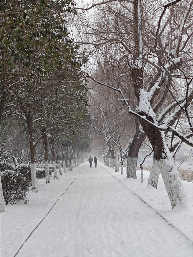 雪停后,市民在公園里悠閑散步。 賈震 攝