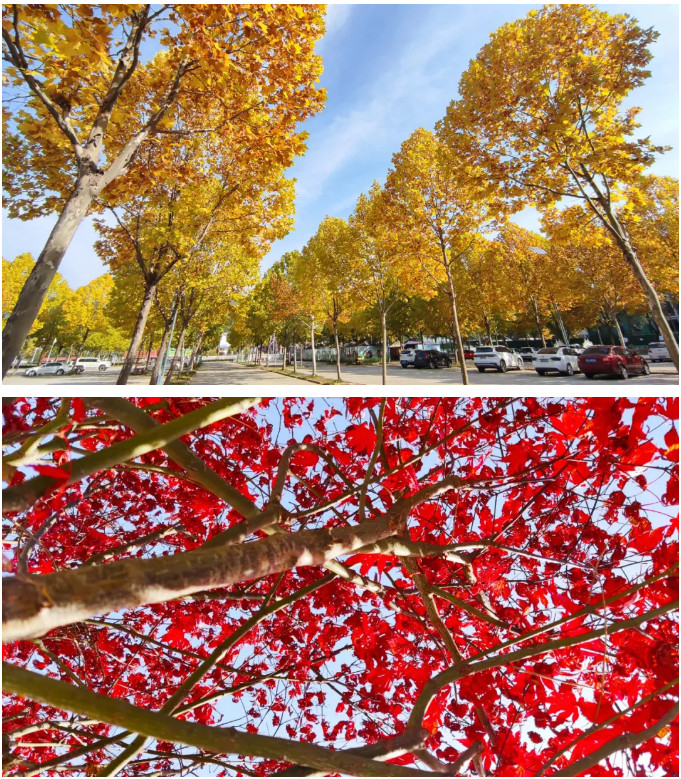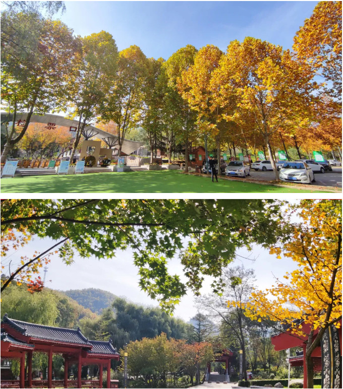 十幾分鐘車程,沿路或近或遠(yuǎn)的景色也是美極了。多彩是秋的最佳特色,還未入園,僅是雞冠洞停車場的這片梧桐林,便在向我們顯示了這個季節(jié)的絢爛。