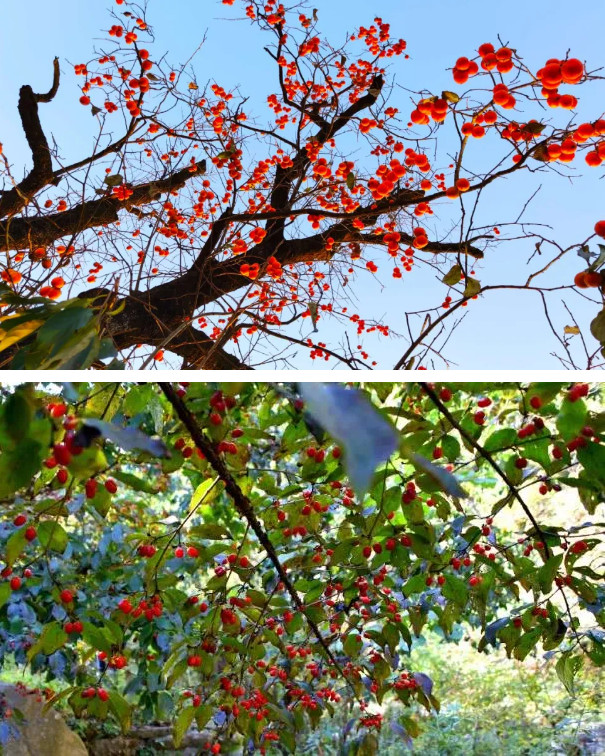 紅葉掛嶺,枝頭有柿子,林道茱萸紅!