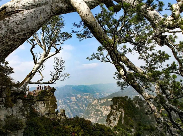 龍鱗松橫掛崖壁,翠綠的松針和雪白的枝干被陽光鍍上一層淺金色,耀眼奪目;