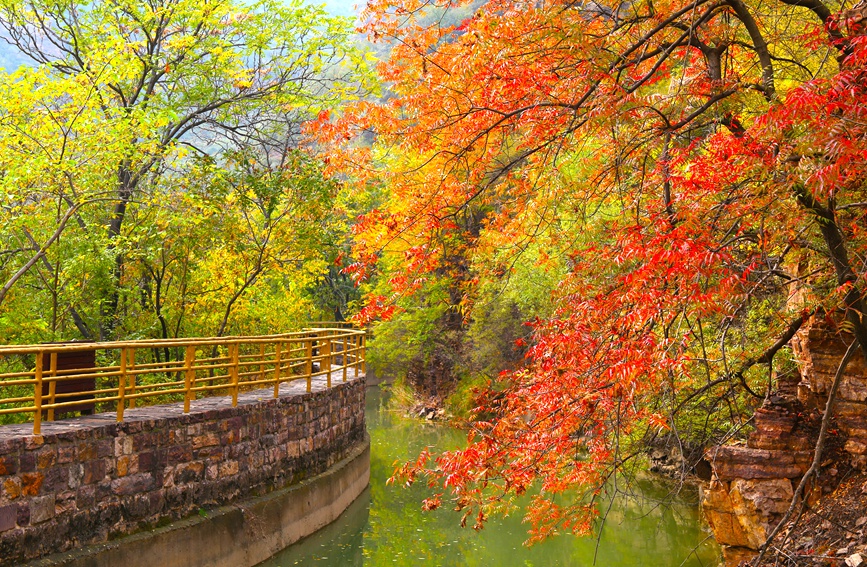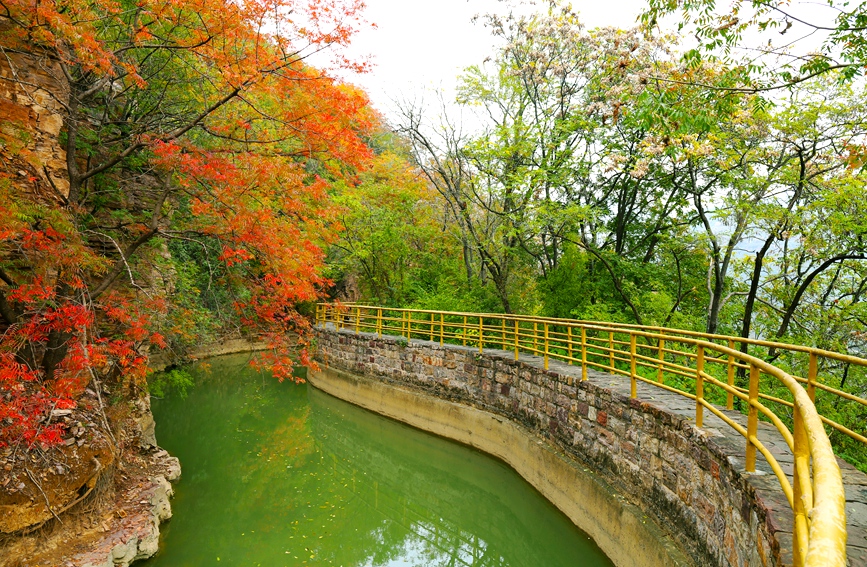 眼下正值初冬時節(jié),巍巍太行層林盡染,燦若云霞,美不勝收。陽光下的紅葉仿佛暖霞飛瀉,由淺紅到深紅,不斷變換著色彩,風吹過時搖曳萬種風情。群山秀嶺間,一抹流動的綠色飄帶纏繞其間。這條飄帶便是被稱為“世界奇跡”“人工天河”的紅旗渠。