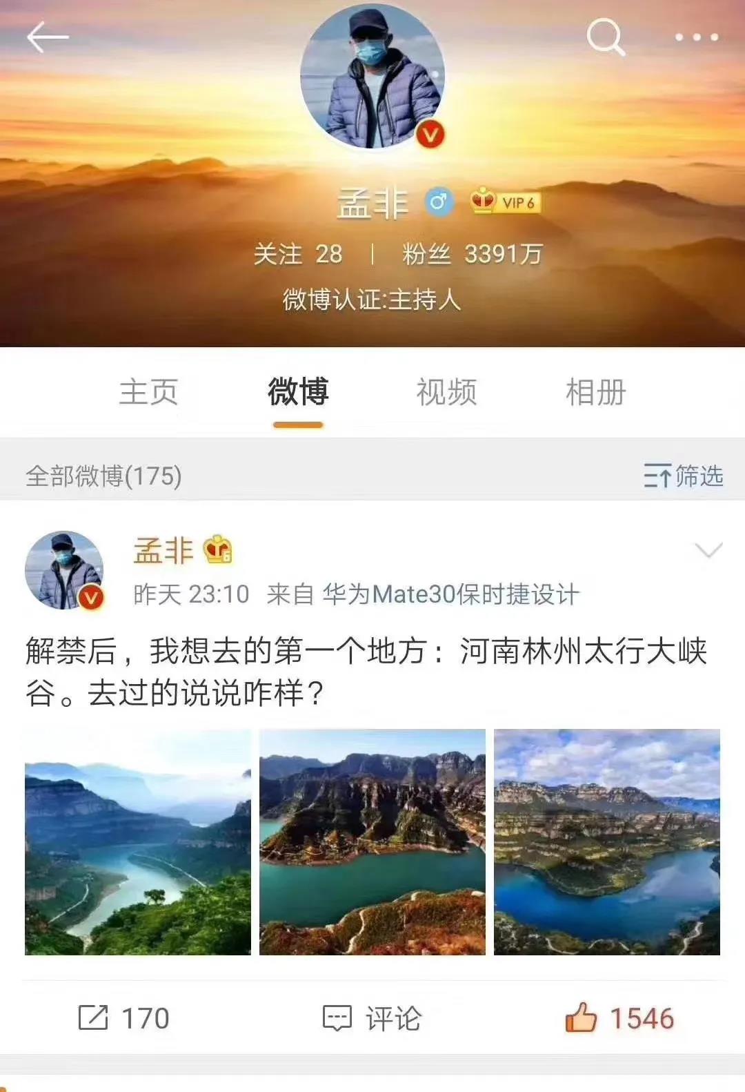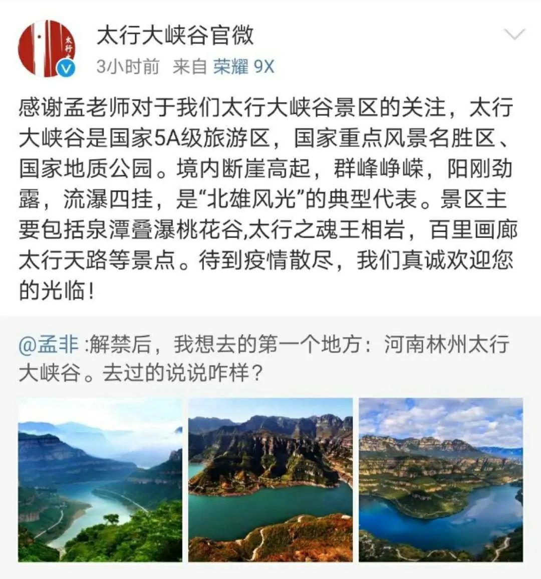 其實,早在解禁前,主持人孟非就發(fā)微博說想去太行大峽谷,大峽谷官微轉(zhuǎn)發(fā)表示歡迎。