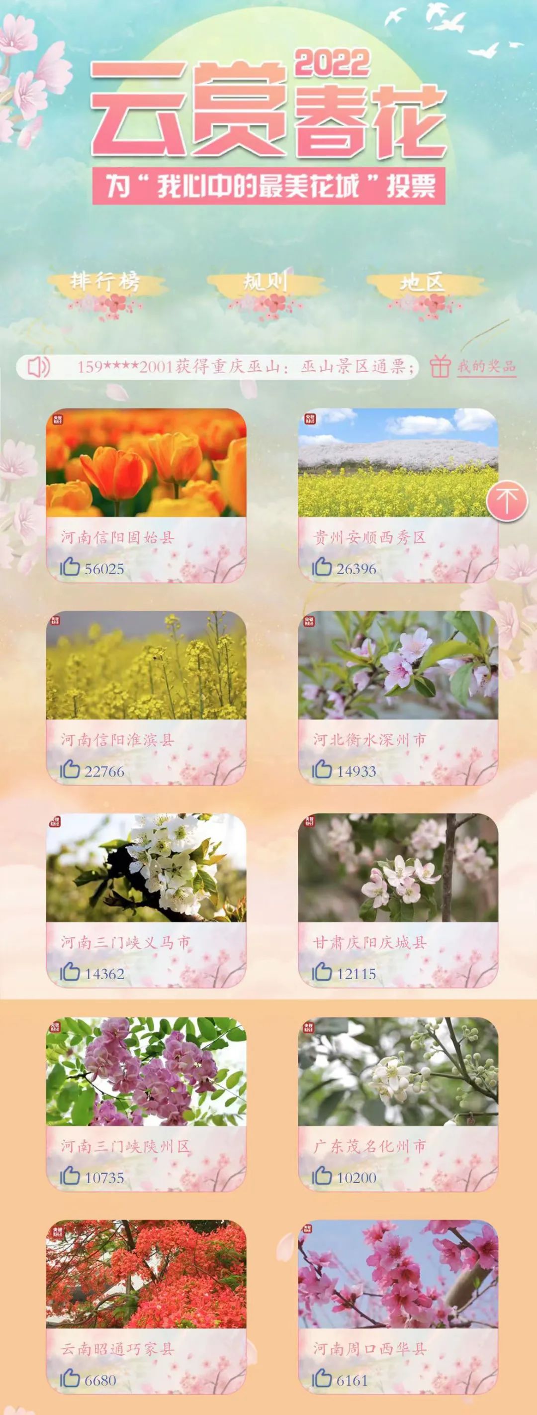 2022年4月20日,央視財(cái)經(jīng)新媒體攜手《生財(cái)有道》欄目,共同發(fā)起的《2022云賞春花》融媒體活動(dòng)正式上線!在近3000萬人次的踴躍參與下,5月20日活動(dòng)圓滿收官,《2022云賞春花》十大“我心中的最美花城”結(jié)果重磅出爐, 截至20日24時(shí),河南信陽固始縣憑借西九華山郁金香花海斬獲56025票,贏得“我心中的最美花城”桂冠。