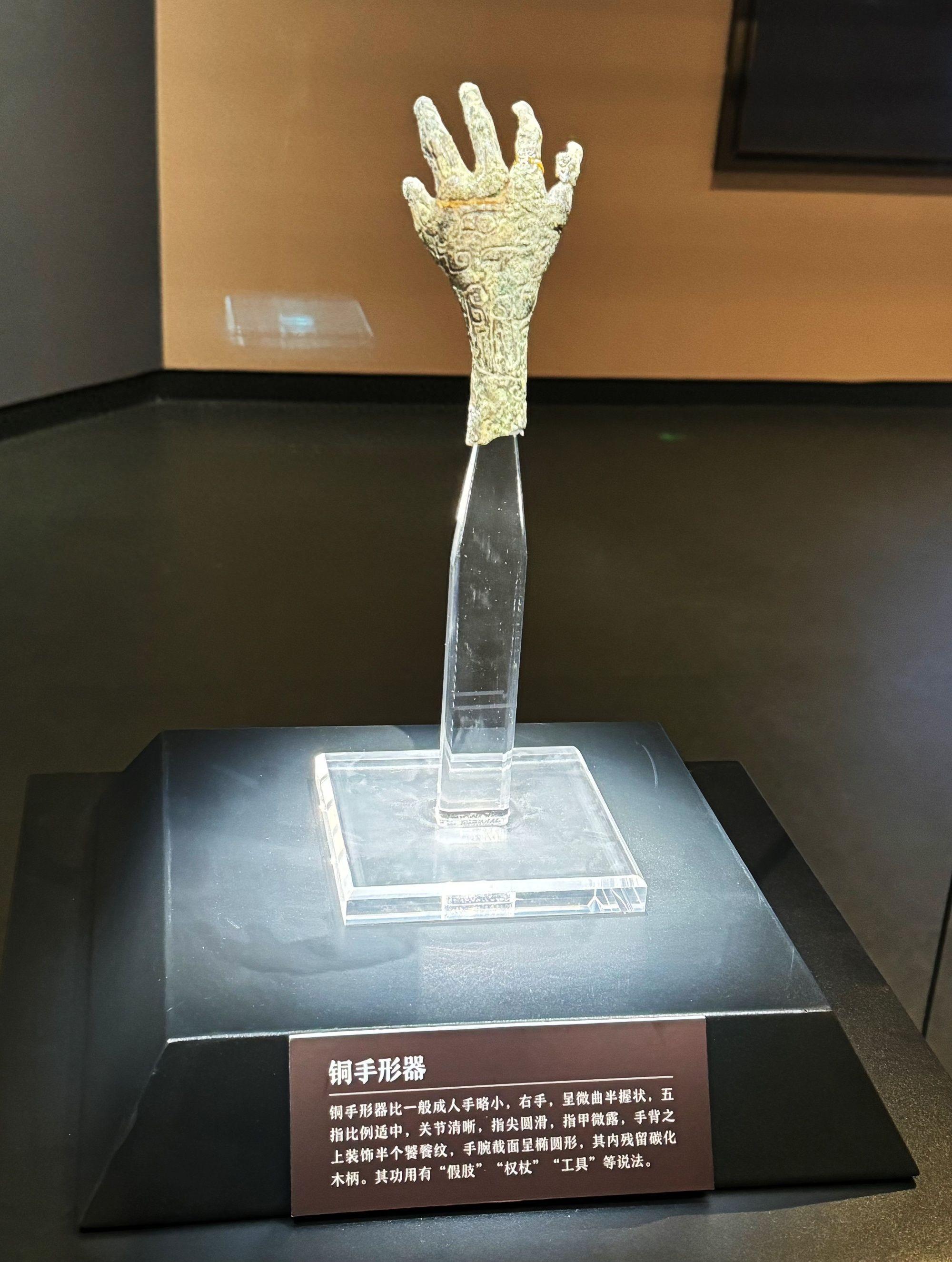 講解員:它的外觀就是一個(gè)右手的造型,可以看到五指的比例是適中的,指關(guān)節(jié)明顯,指尖非常圓滑。推測(cè)它有可能就是當(dāng)時(shí)權(quán)杖、假肢、笊籬,甚至還有“癢癢撓”的說(shuō)法,那具體哪種說(shuō)法正確,目前學(xué)術(shù)界還暫沒(méi)有一個(gè)定論。