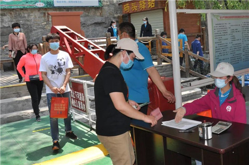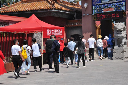 景區(qū)工作人員一絲不茍的對(duì)游客進(jìn)行體溫檢測(cè)。
