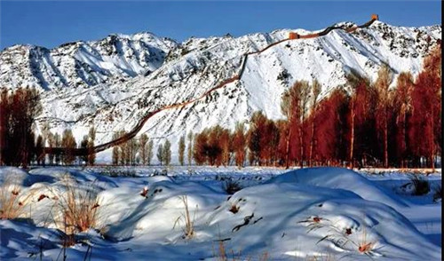 在嘉峪關(guān)城樓西北約6公里處有一段長城,依山勢而建,直至黑山山頂。