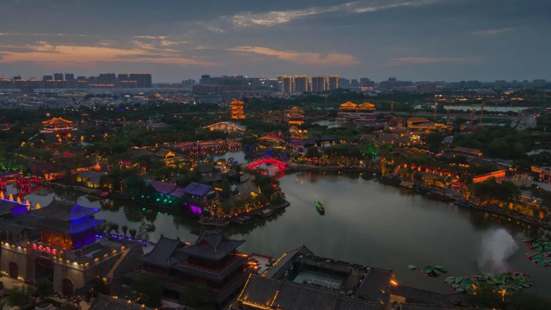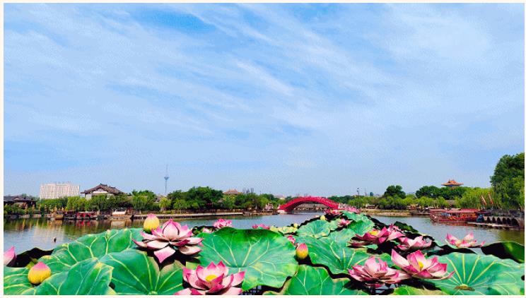 清明上河園秋色初顯,微風(fēng)吹動(dòng)綠柳搖曳,波光粼粼荷花蕩漾。