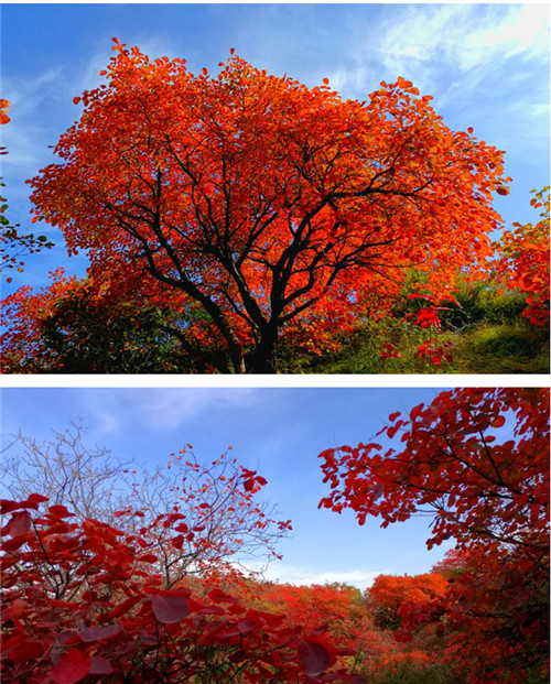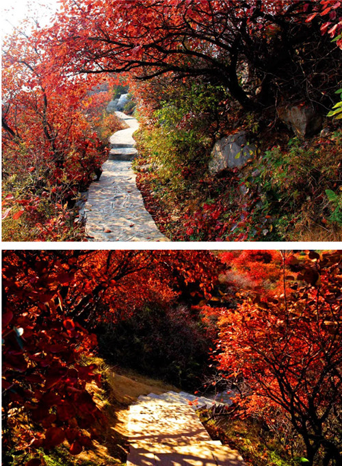 整個(gè)山坡被紅葉覆蓋著,在陽(yáng)光的照耀下,猶如一團(tuán)團(tuán)的火焰在燃燒。朝霞初照,像落在山腰的紅云彩;晚霞輝映,又像一團(tuán)團(tuán)紅瑪瑙。中國(guó)紅,早已成為了秋天長(zhǎng)壽山的神韻與底色。