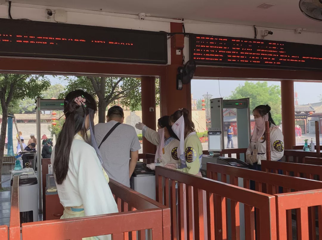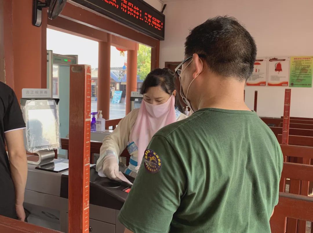 準備進入景區(qū)的游客排隊出示“綠色健康碼”、測量體溫、1.5米安全間隔、信息登記、文明旅游貼標、井然有序,做到了方便、快捷。