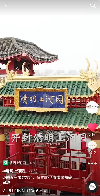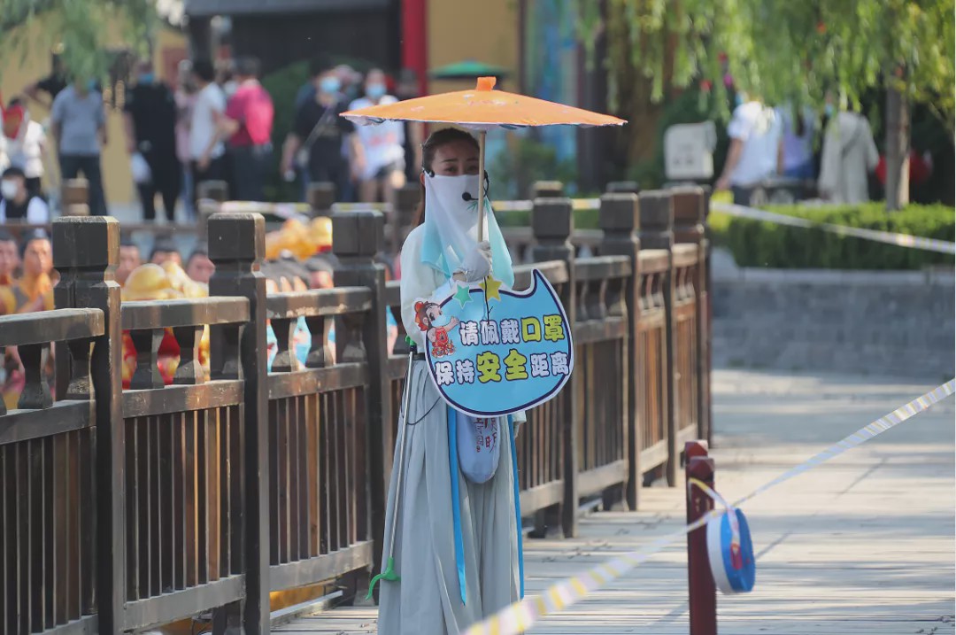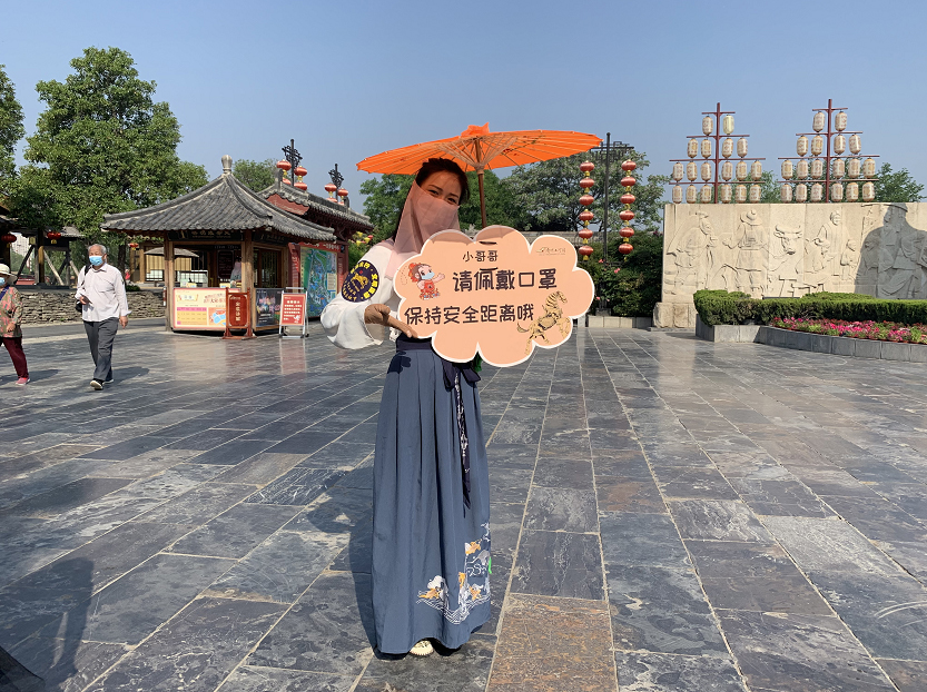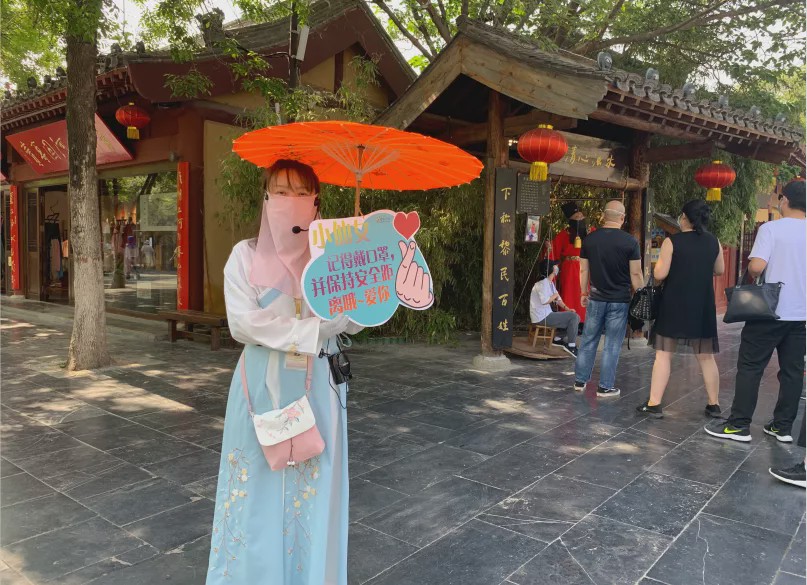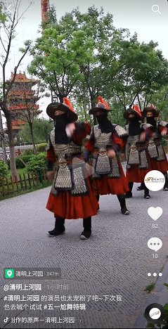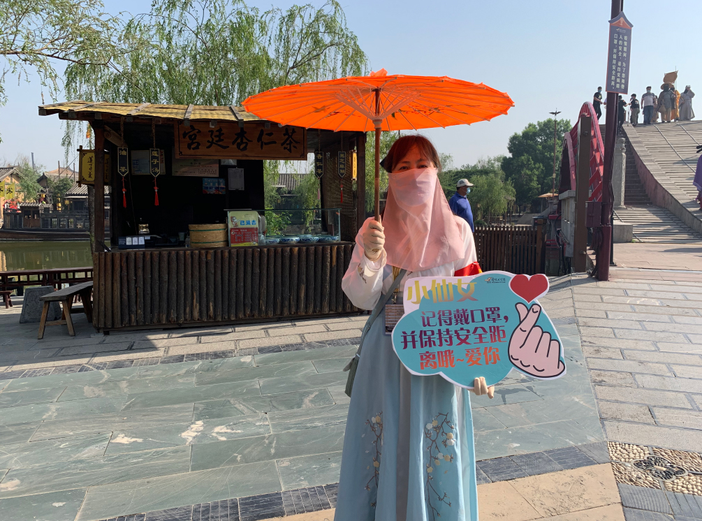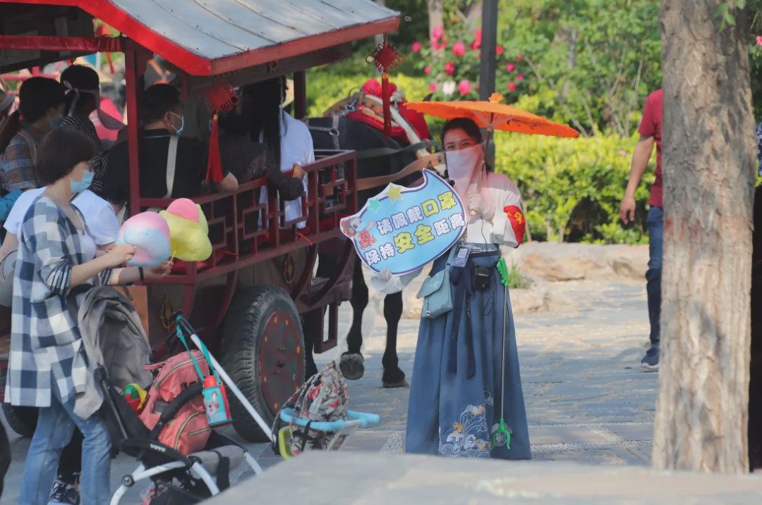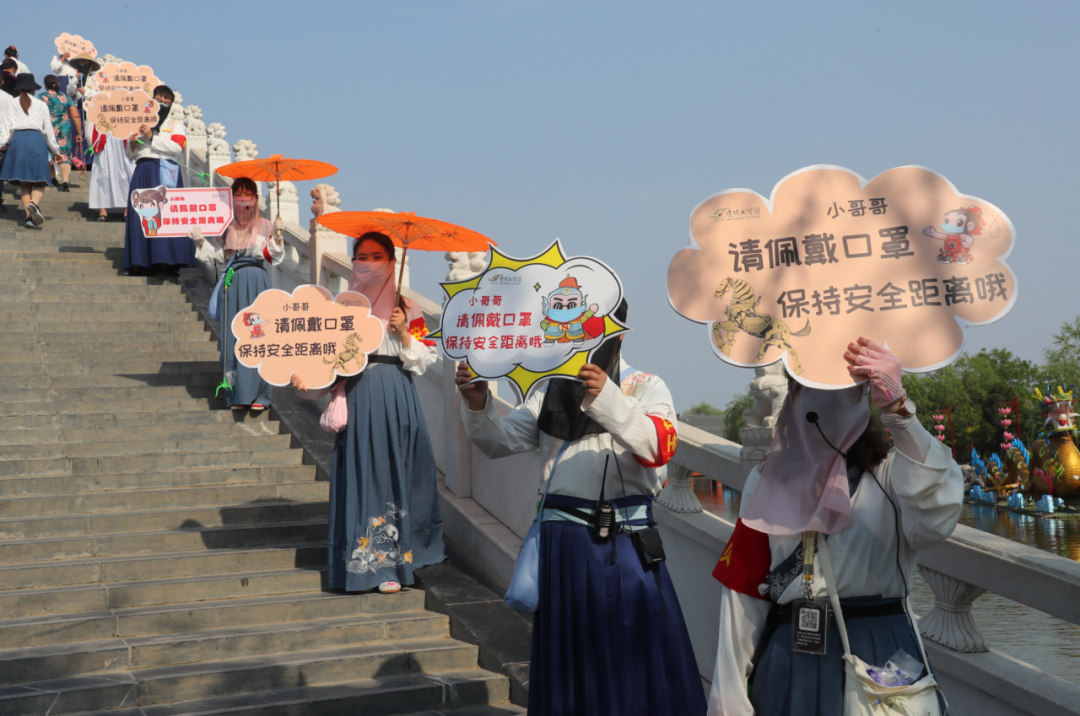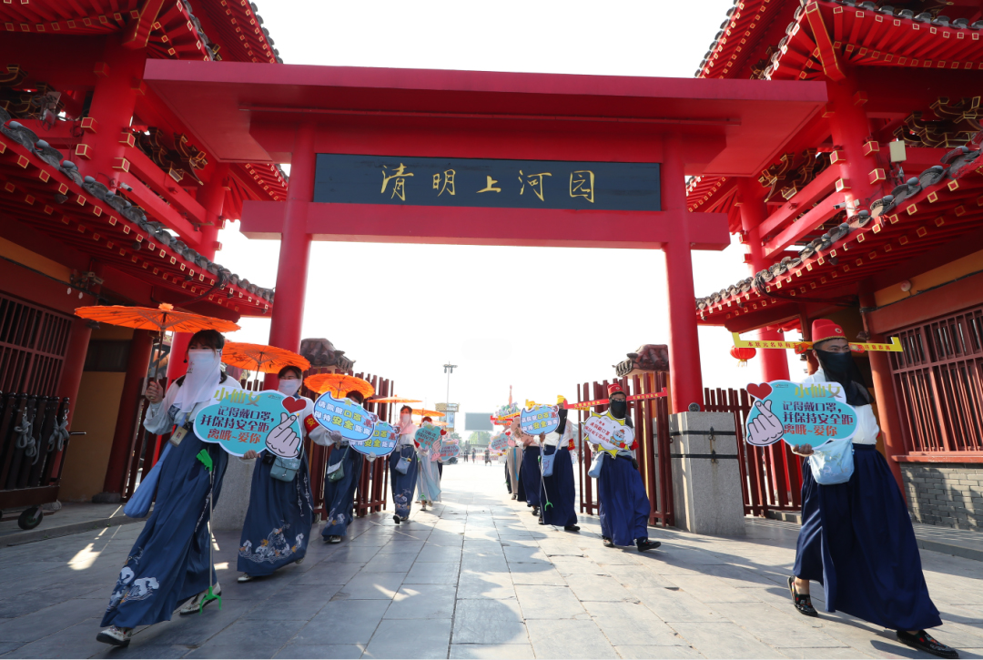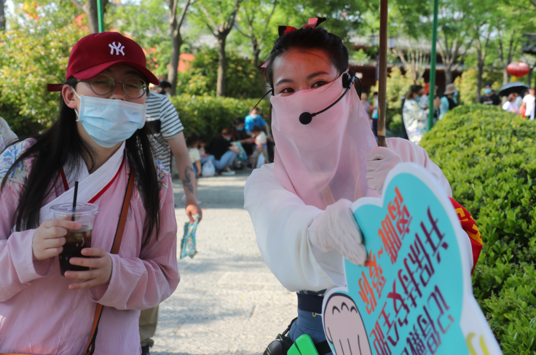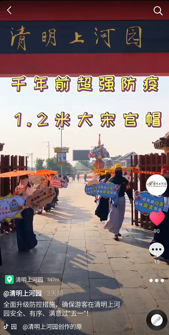 這個“五一”,清明上河園創(chuàng)新結(jié)合大宋文化和防疫需求,推出讓工作人員穿宋裝戴1.2米長帽翅的“宋式官帽”在園區(qū)巡視并提示游客,通過這種趣味性的方式提示游客保持距離、文明游覽,得到游客的一致好評,其中結(jié)合此創(chuàng)意拍攝的短視頻成為當日新浪微博熱搜前40,累計播放量超過1000萬次。