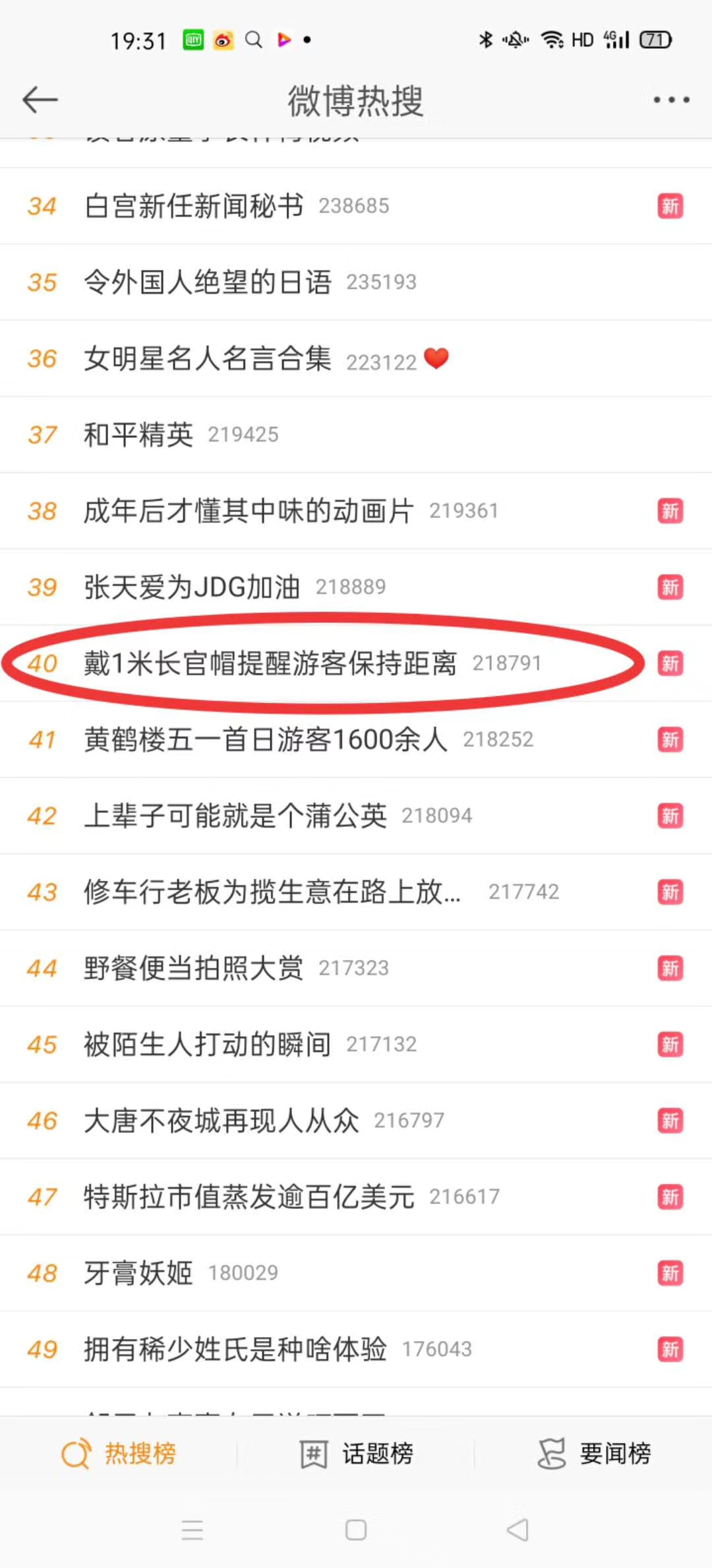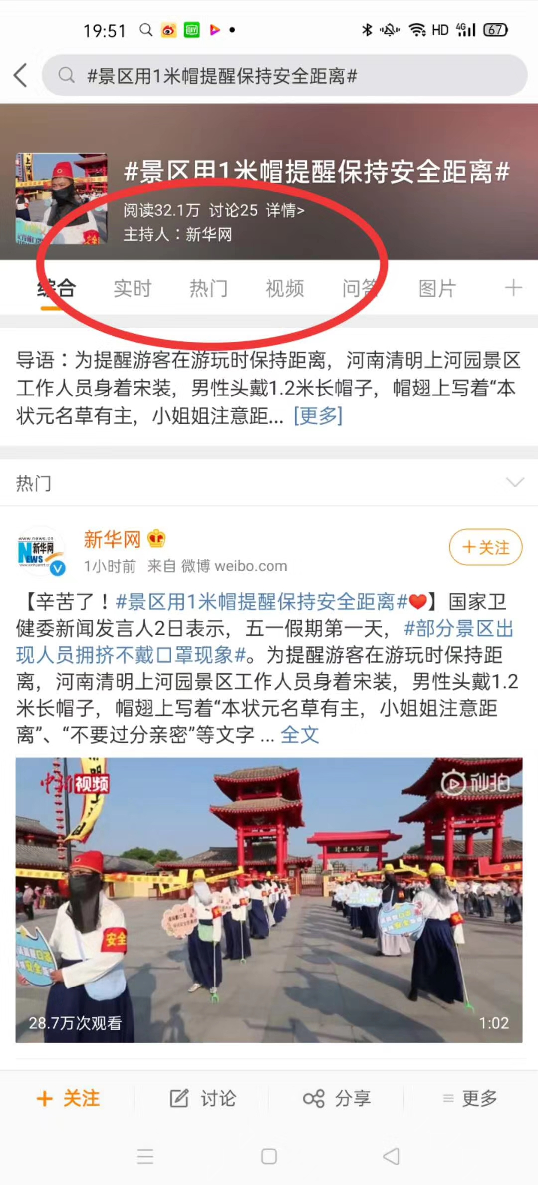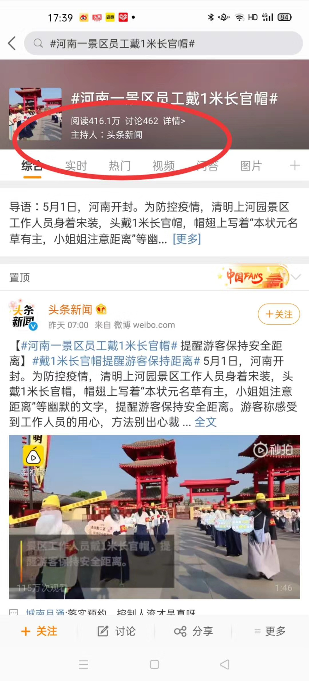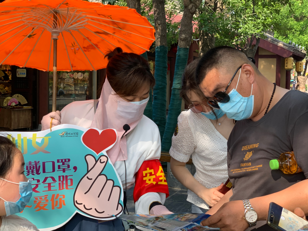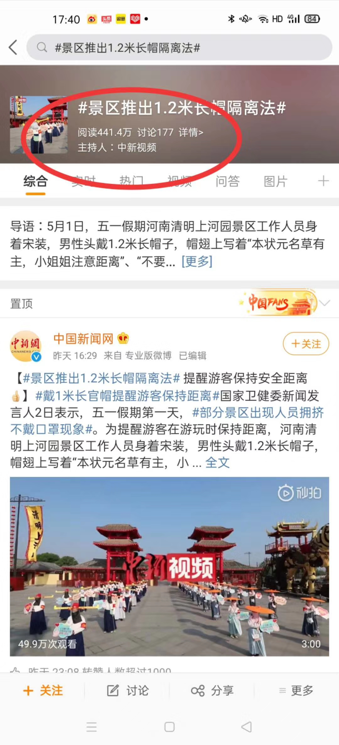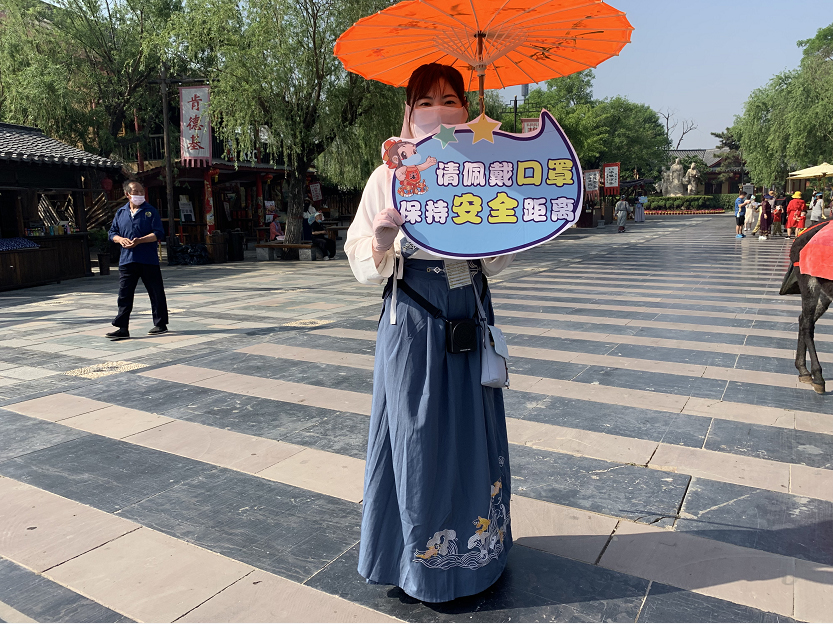 這個“五一”,清明上河園創(chuàng)新結(jié)合大宋文化和防疫需求,推出讓工作人員穿宋裝戴1.2米長帽翅的“宋式官帽”在園區(qū)巡視并提示游客,通過這種趣味性的方式提示游客保持距離、文明游覽,得到游客的一致好評,其中結(jié)合此創(chuàng)意拍攝的短視頻成為當日新浪微博熱搜前40,累計播放量超過1000萬次。