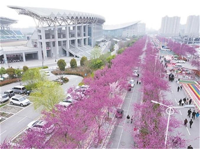 位于汝州市體育中心農業(yè)路的紫荊大道長約3km,路兩邊各種植3排紫荊名優(yōu)新品,樹高可達20-30米,花期3月中旬到4月上旬。每年這個時候,紫荊大道玫紅色似紫蝶般的花朵先葉綻放,密密匝匝,簇生于枝條上,花木馥郁繁茂,形成花團錦簇的觀賞長廊,被譽為汝州“紫荊花觀賞第一路”“網(wǎng)紅打卡地”。