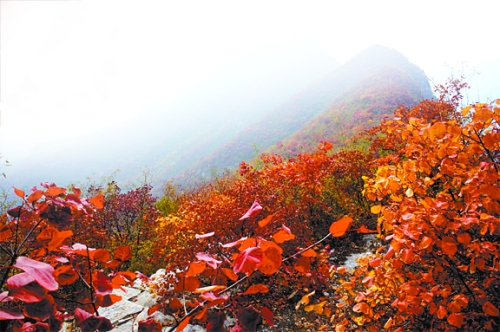 由于紅葉樹種不同,加之堯山海拔高度的變化,堯山的紅葉從山頂?shù)缴焦纫来巫儞Q色彩,層次感很強。紅楓谷是丹楓最集中的地方,從將軍谷進入,經(jīng)石板河,步道兩邊、山上楓枝舒展,“萬片作霞延日麗”,走在其間,如入紅色紗帳。漫步在石板路上,株株丹楓,映紅游人的臉龐,在約1500米的紅楓谷,兩側(cè)的山坡上,高的、低的、粗的、細的楓樹把整個山谷裝扮得分外妖嬈。