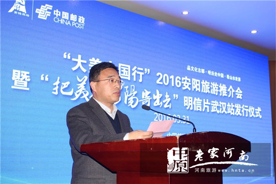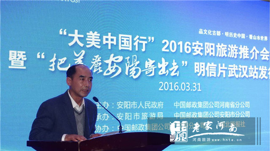 3月31日,“大美中國行2016安陽旅游推介會暨‘把美麗安陽寄出去’明信片發(fā)行儀式”在湖北武漢成功舉辦,武漢市旅行商、自駕俱樂部、郵政公司和媒體二百余家單位參與活動。武漢市旅游局副局長徐緒群、中國郵政集團公司武漢市分公司副總經(jīng)理葉劍龍、國旅武漢公司總經(jīng)理陶頎,安陽市旅游局局長史景山、中國郵政集團公司安陽市分公司總經(jīng)理張紅旗、中國郵政集團公司安陽市分公司黨委書記毛萬秋等出席了此次活動。