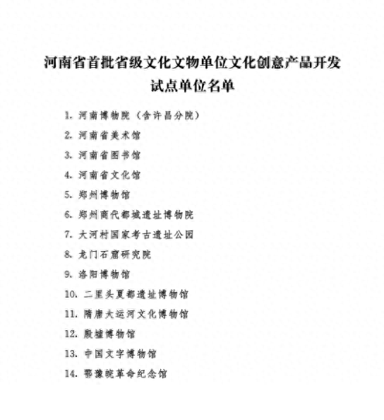 河南博物院(含許昌分院)、河南省美術(shù)館、河南省圖書館、河南省文化館、鄭州博物館、鄭州商代都城遺址博物院、大河村國家考古遺址公園、龍門石窟研究院、洛陽博物館、二里頭夏都遺址博物館、隋唐大運(yùn)河文化博物館、殷墟博物館、中國文字博物館、鄂豫皖革命紀(jì)念館等14家單位入選。